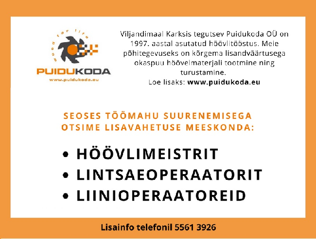 Puidukoda OÜ ootab oma meeskonda LIINIOPERATOREID kelle ülesandeks on: höövelmaterjali lahti ja kokku pakkimine materjali sorteerimine Oskuste omandamisel tulevikus...