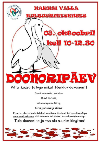 Kolmapäeval 8, oktoobril on kõik senised ja uued doonorid oodatud kell 10-12.30 Karksi Valla Kultuurikeskusesse doonoripäevale. Kindlasti tuleb kaasa võtta isikut tõendav dokument.